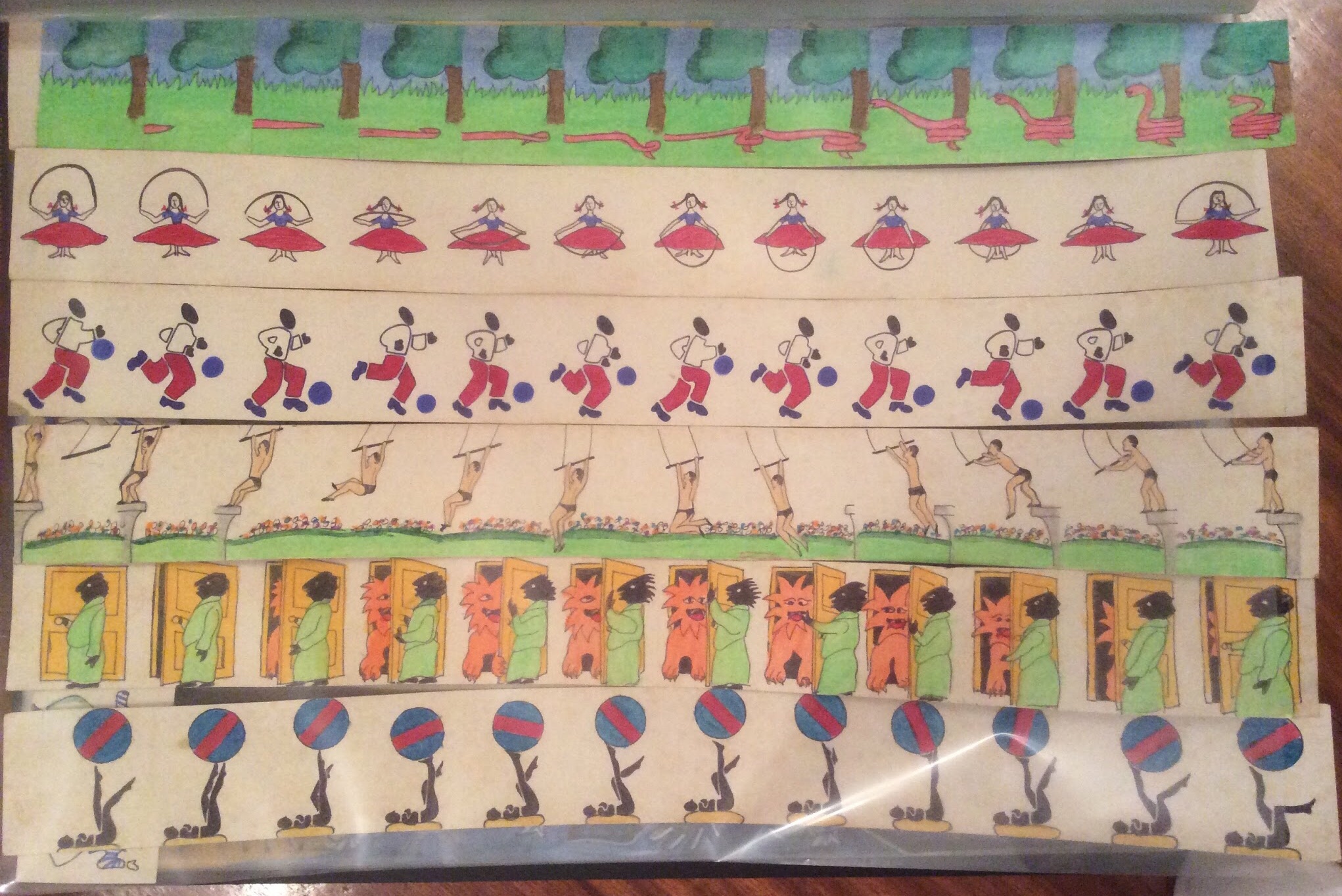 κατόπιν έκοψε επτά χαρτονένιες κορδέλες πλατιές όσο το μισό ύψος του κυλίνδρου. πάνω τους ζωγράφισε με παστέλ και πολύχρωμα μολύβια επτά χαριτωμένα θέματα. το κάθε ένα από αυτά το επανέλαβε αντιγράφοντάς το δώδεκα φορές, αλλά παραλάσσοντάς το τόσο λίγο κάθε φορά, όσο η κάθε μια από τις δώδεκα εικόνες του να ενσωματώσει λίγη κίνηση.