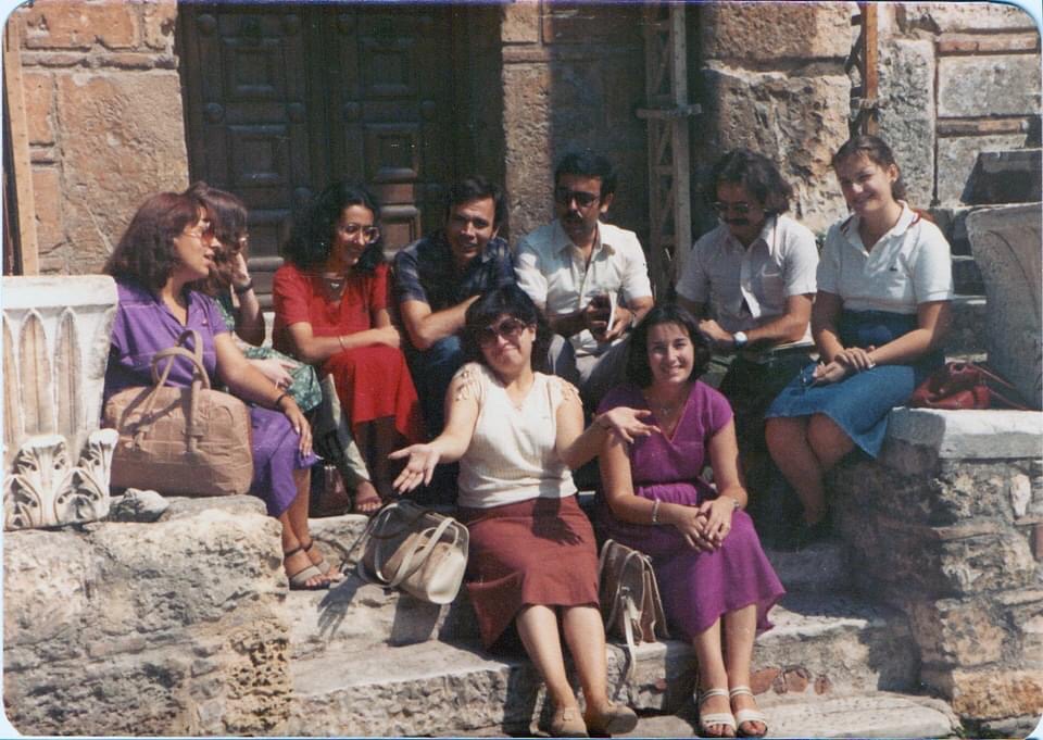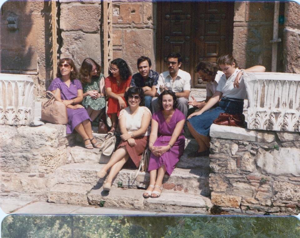 Μονή Δαφνίου, Σεπτέμβριος 1979. Καίτη Καλαντζή, Λίνα Στρατή, Αριστέα Καββαδία, Νίκος Ζήκος, Γιώργος Μαστορόπουλος, Δημήτρης Καλομοιράκης, Κατερίνα Δελλαπόρτα, εγώ, Ιωάννα Μακρή, Κώστας Σκαμπαβίας, Λίτσα Παπαθεοφάνους, Κώστας Τσουρής
