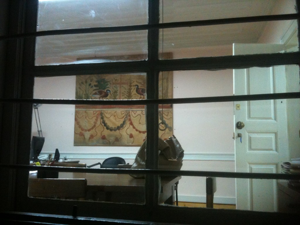 κατόπιν ακολουθώντας το Σταμάτη Χονδρογιάννη στη Ροτόντα επισκέφθηκα πρωτοπατώντας με το δεξί το πολυσυζητημένο μεν, μοντέρνο δε και απλό καινούργιο του γραφείο, και από τον ίδιο πληροφορήθηκα ότι τα δύο έργα του Λεφάκη φυλάσσονται πλέον σε αποθήκη του Επταπυργίου. παλιατζουρίες γαρ, είχαν αντικατασταθεί από δύο αφίσες με χαρακτικά της αγοράς που εικόνιζαν τον Καποδίστρια και κάποιον άλλον ακόμη, ξέχασα..