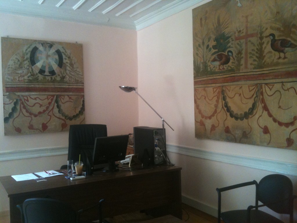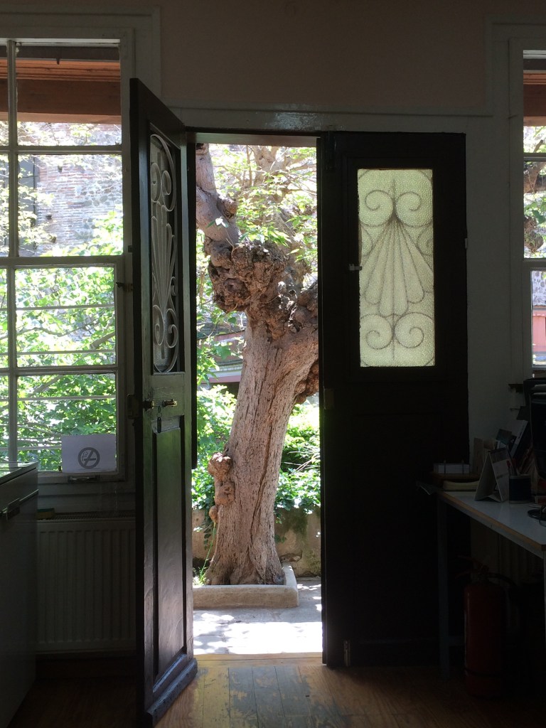 με περισσή χαρά είδα τους παλιούς μου συναδέλφους, που είχαν μάλιστα την πρόνοια να περιμαζέψουν στο γραφείο τους το ξύλινο τραπέζι συσκέψεων της 9ης Εφορείας Βυζαντινών Αρχαιοτήτων που υπήρχε στο γραφείο των προϊσταμένων παλαιόθεν. θα υπήρχε μάλλον και στην Καμβουνίων, όπου στεγαζόταν η Εφορεία πριν τη Ροτόντα. εγώ το είχα βρει στη Ροτόντα το 1978, όταν είχα πάει να ζητήσω δουλειά, πριν γίνουν οι εισαγωγικές εξετάσεις στην Αρχαιολογική Υπηρεσία τον Ιανουάριο του 1979 και λάβω μέρος.
