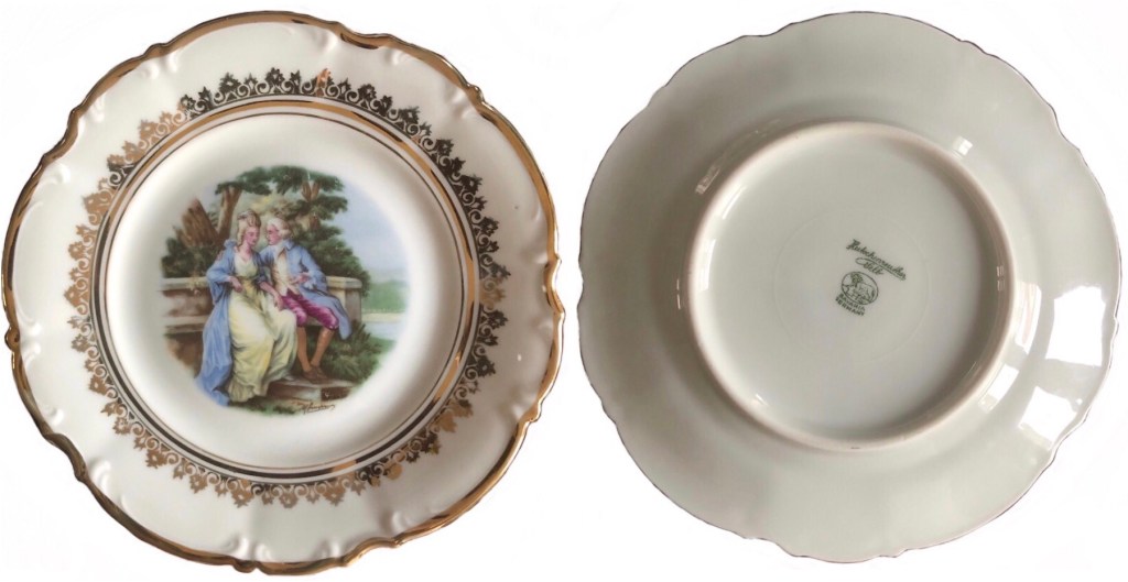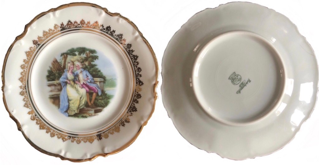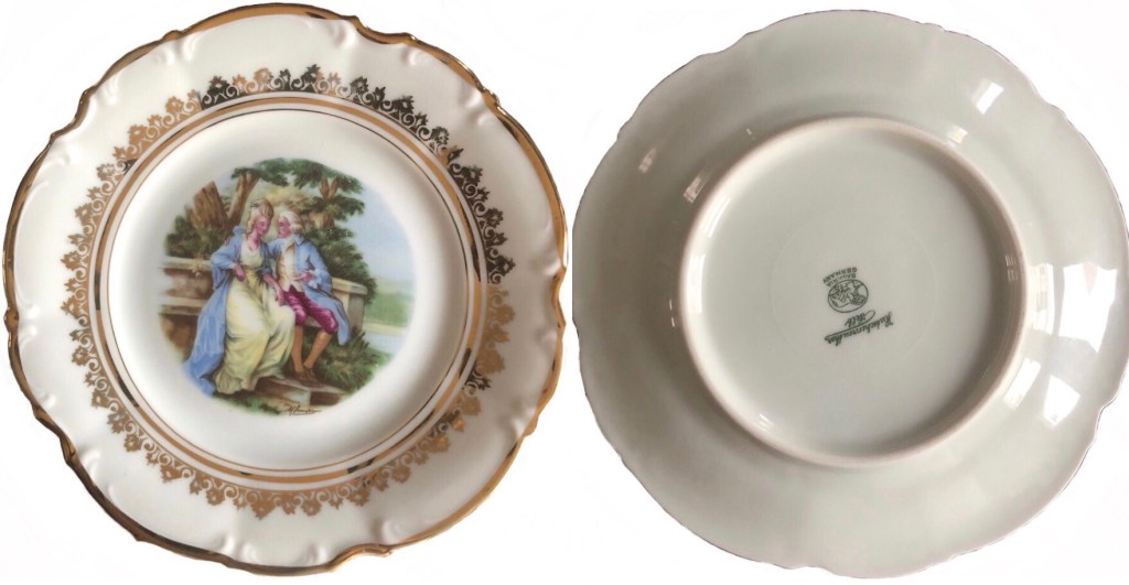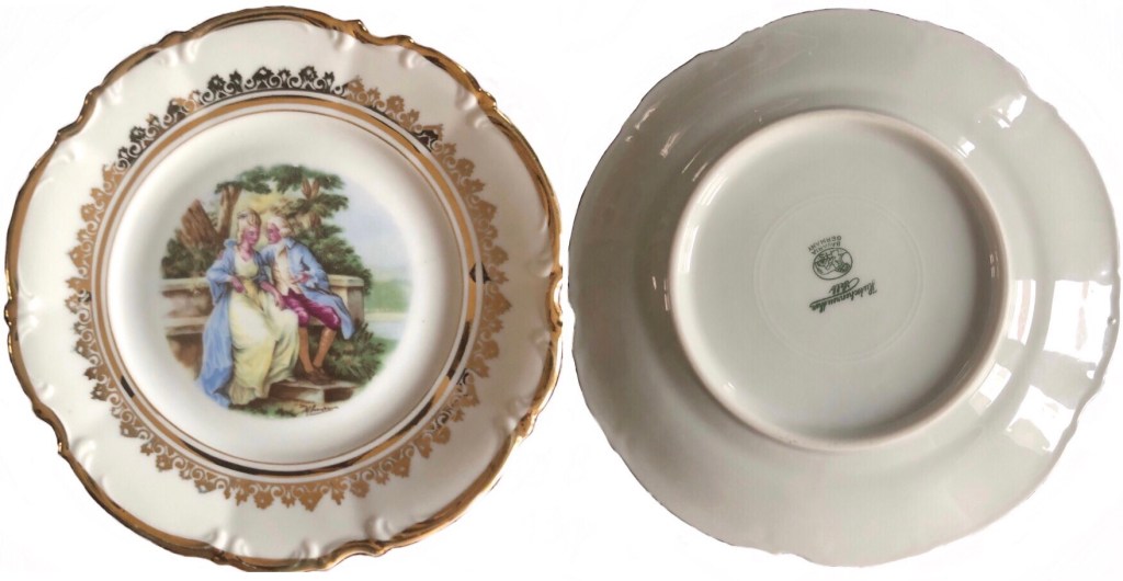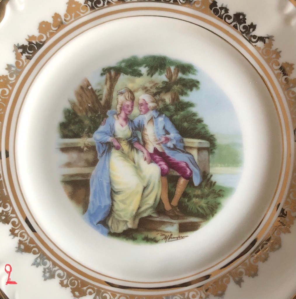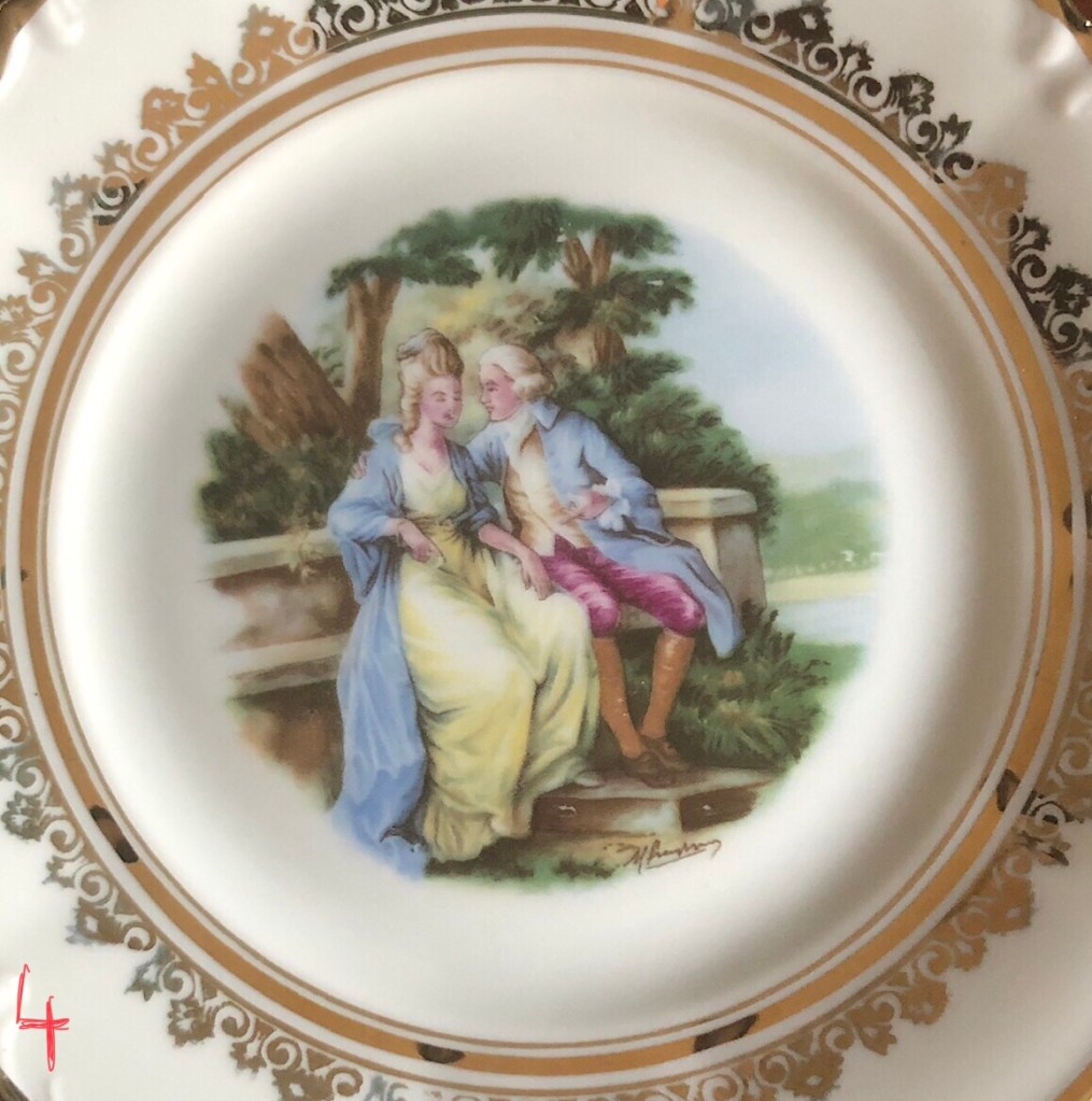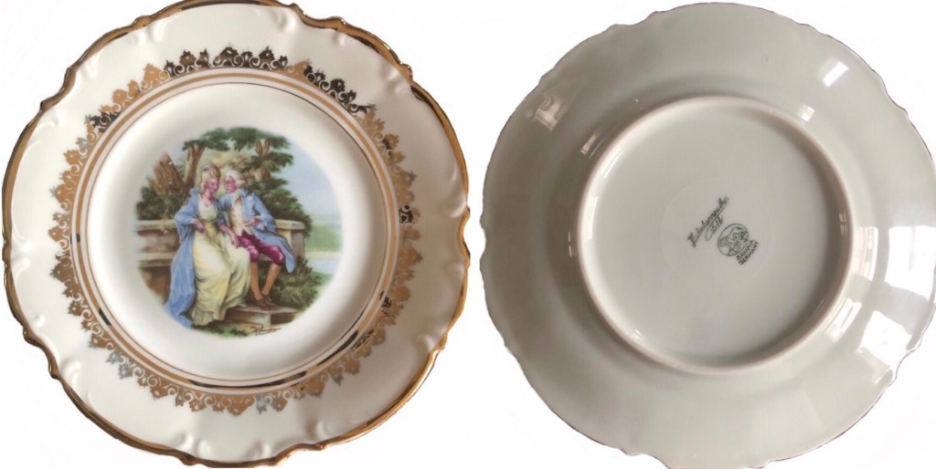 ελληνική αγορά του 1953.. είχα από παιδί την περιέργεια τί να σημαίνουν τα γραμματάκια και τα σύμβολα στην πίσω -κάτω- πλευρά των πορσελάνινων πιατικών που ανέκαθεν μου άρεσε να τα παρατηρώ. χρώματα, χρυσό, κυρίες και κύριοι της γαλλικής μάλλον αριστοκρατίας του 16ου, 17ου αιώνα.