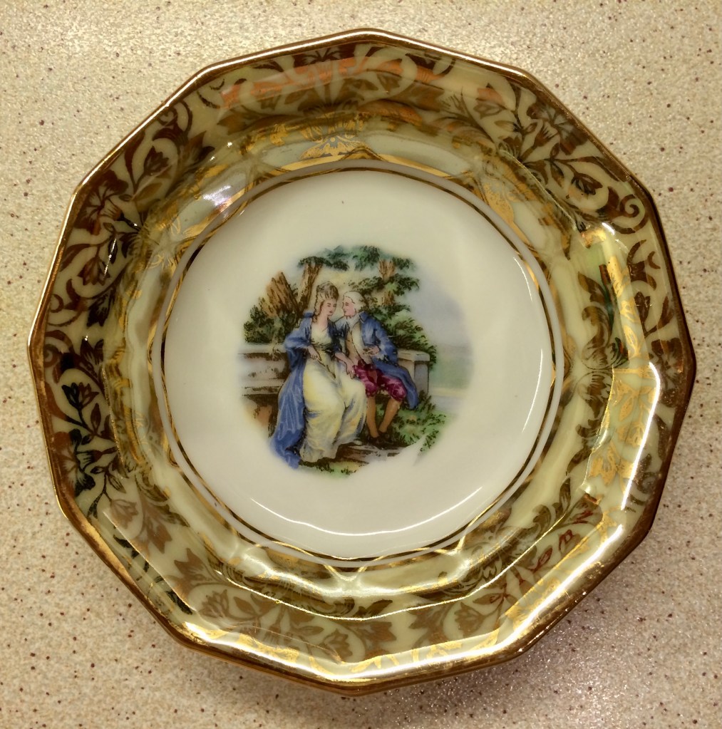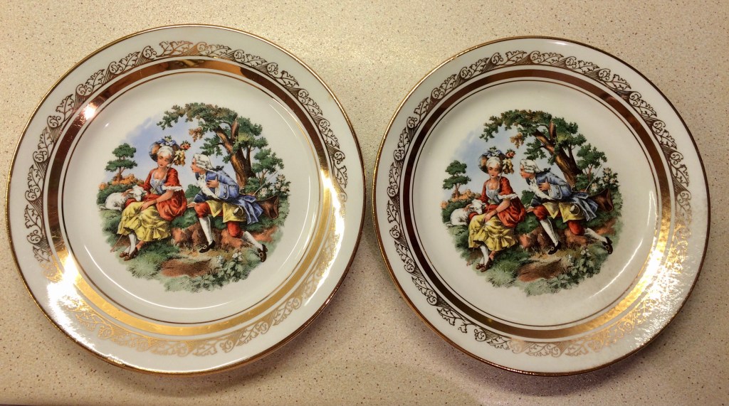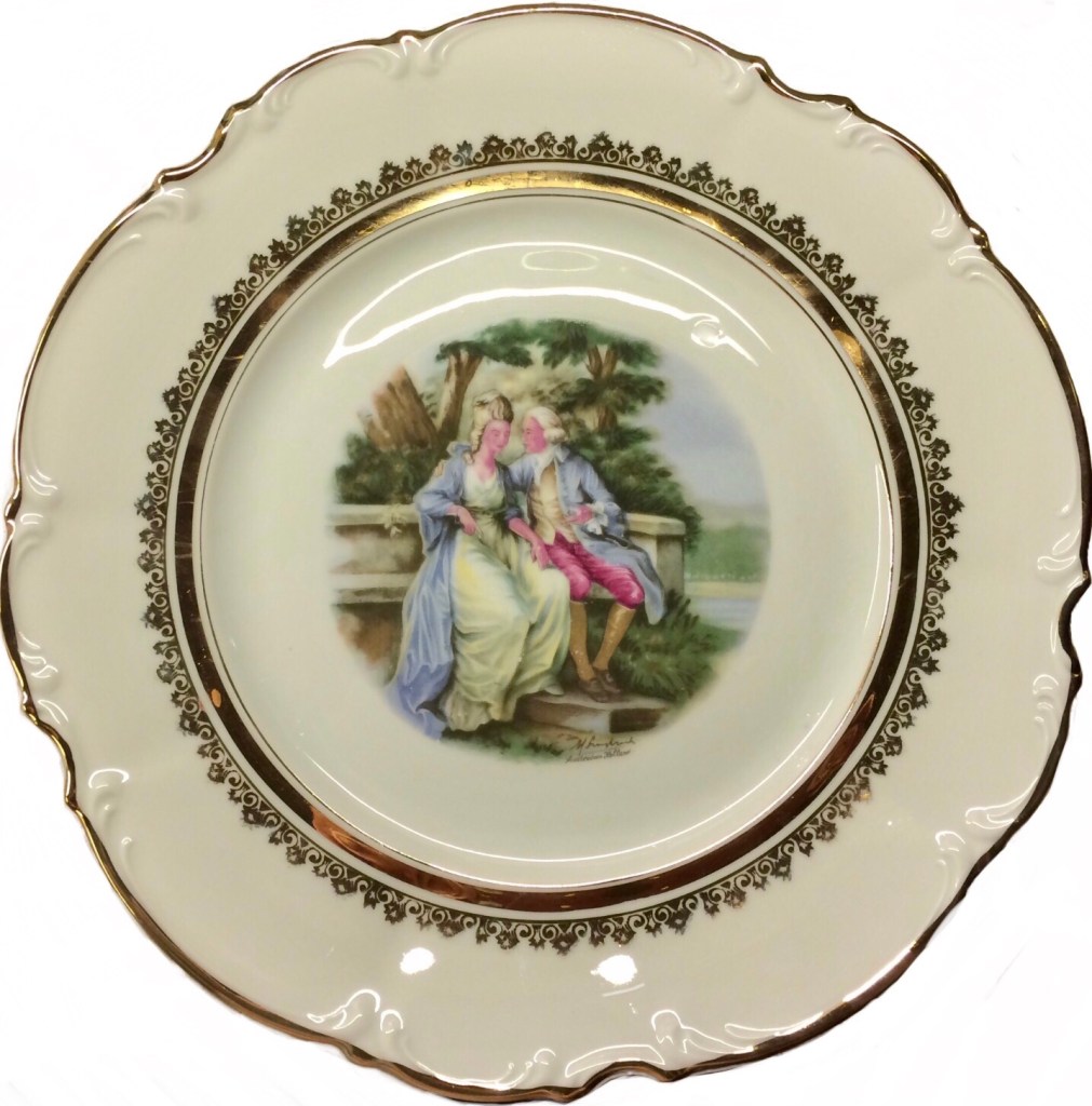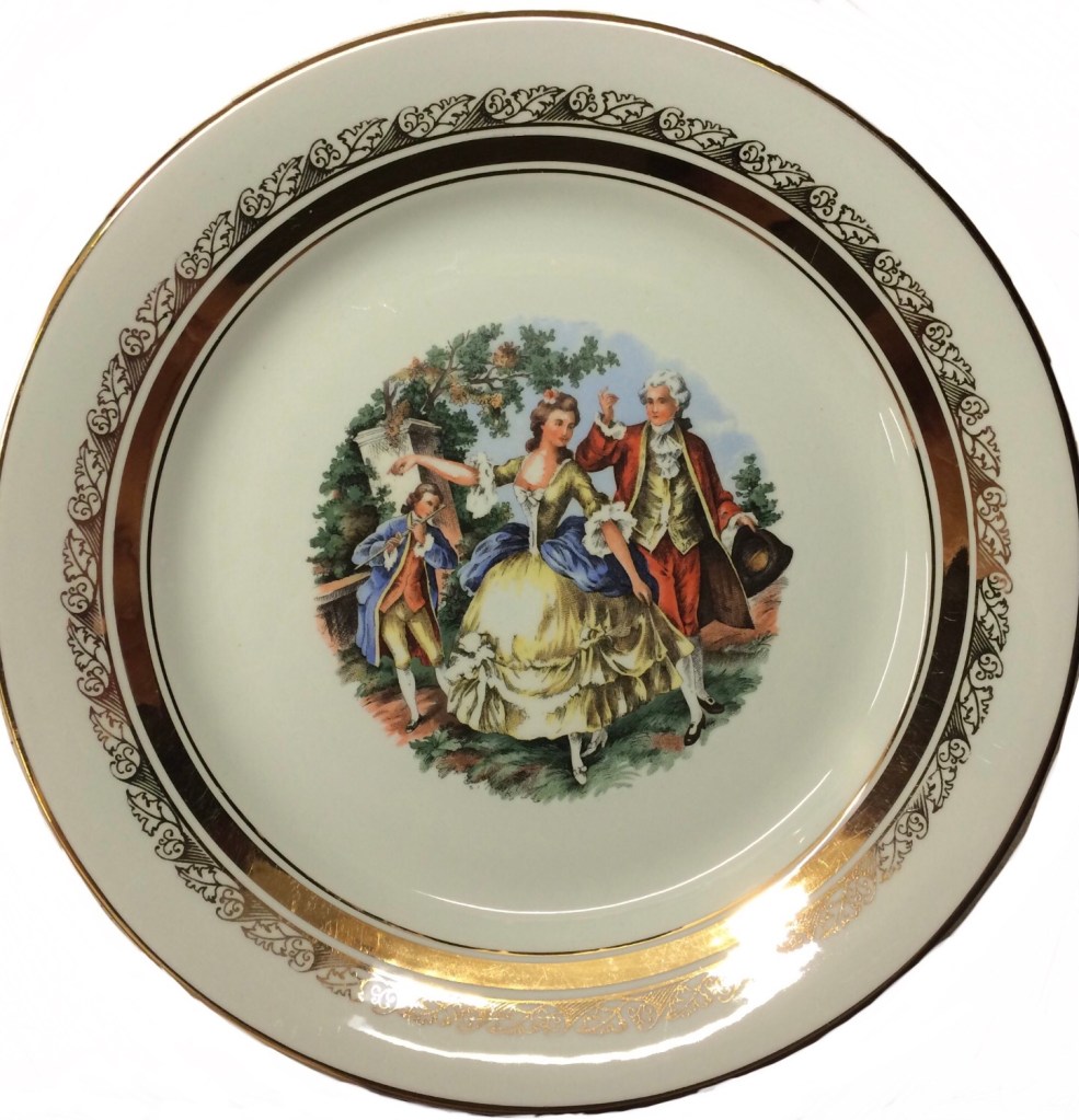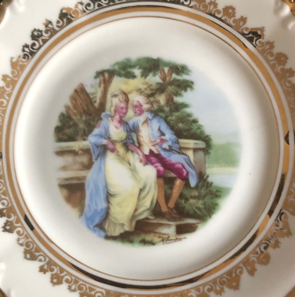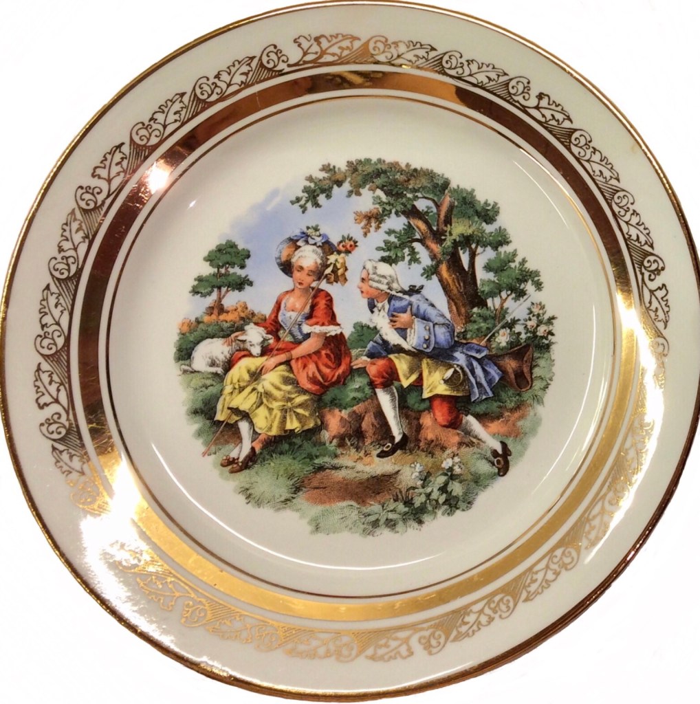 ελληνική αγορά του 1953.. είχα από παιδί την περιέργεια τί να σημαίνουν τα γραμματάκια και τα σύμβολα στην πίσω -κάτω- πλευρά των πορσελάνινων πιατικών που ανέκαθεν μου άρεσε να τα παρατηρώ. χρώματα, χρυσό, κυρίες και κύριοι της γαλλικής μάλλον αριστοκρατίας του 16ου, 17ου αιώνα.
