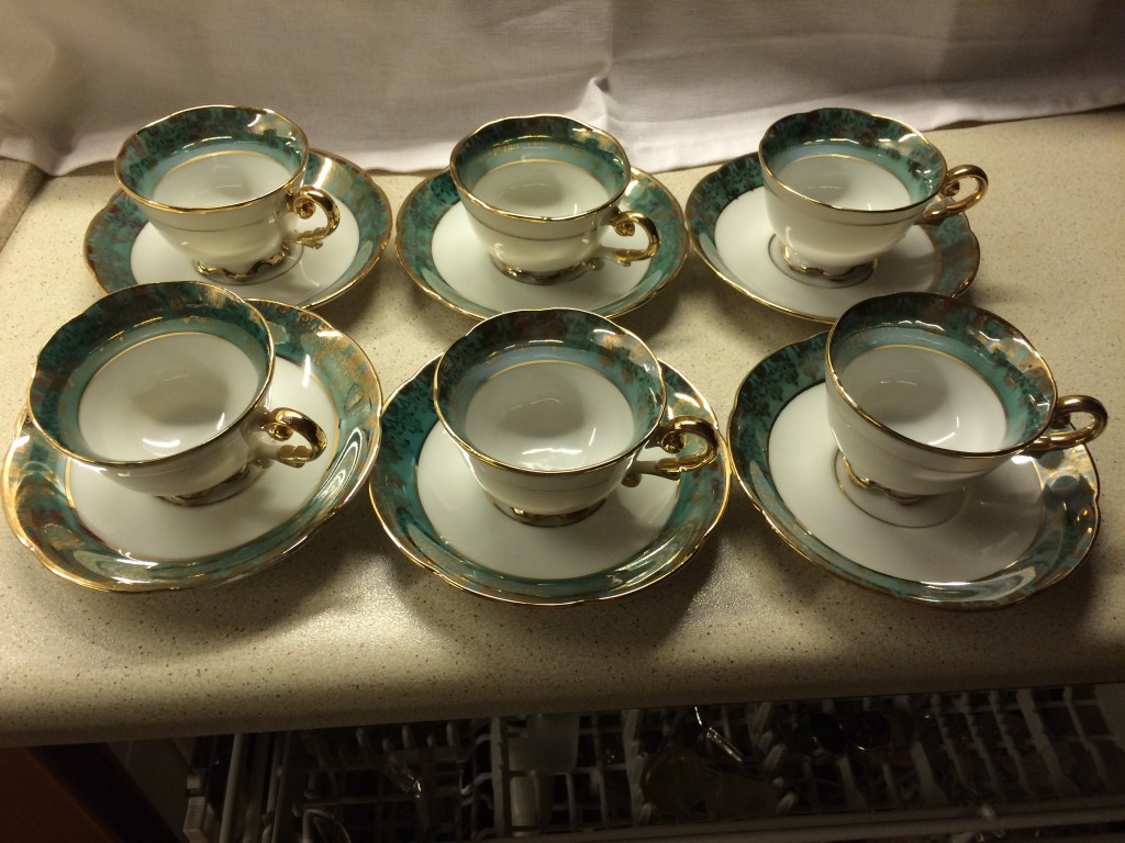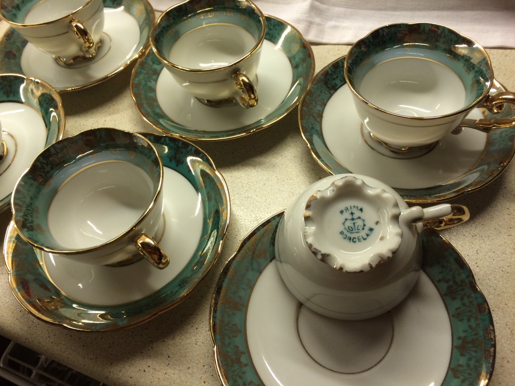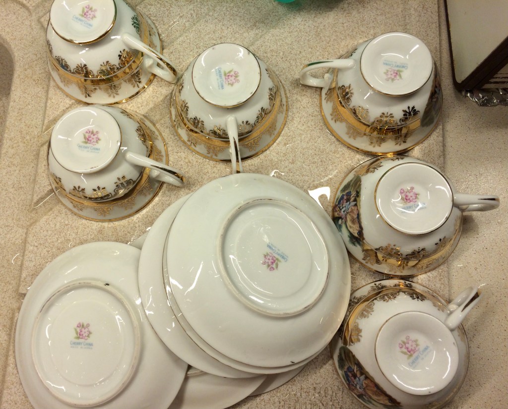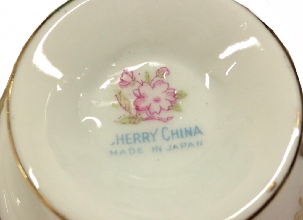 έξι φλιτζάνια του τσαγιού με τα πιατάκια τους από την Ιαπωνία. στη βάση των φλυτζανιών και στην πίσω όψη των πιάτων «CHERRY CHINA / MADE IN JAPAN, ως προοριζόμενο και αυτό για εξαγωγή, και με σήμα ένα λουλούδι, μπουμπούκι και φύλλωμα».