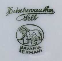η σφραγίδα του εργαστηρίου προέλευσης στο κέντρο της βάσης, Hutschenreuthor / Selb / BAVARIA / GERMANY» με σήμα το λιοντάρι που κινείται προς τα αριστερά μέσα σε έλλειψη που πατάει στο λογότυπο LHS (=Lorenz Hutschenreuther Selb), με μία απόλυτη στροφή των πιάτων δεξιά-αριστερά βρίσκεται σε διαφορετική κατεύθυνση. επομένως έμπαινε με το χέρι. η παραγωγή ήταν προορισμένη για εξαγωγή, όπως φαίνεται από τον αγγλικό τρόπο διατύπωσης της χώρας προέλευσης στο σήμα του εργαστηρίου.