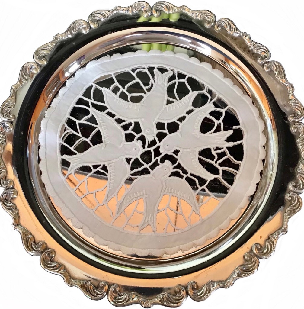 ο δίσκος και το κέντημα. δώρο γάμου κι αυτό. εγώ το ζωγράφισα κάπου στα 1980, η μαμά μου το κέντησε.