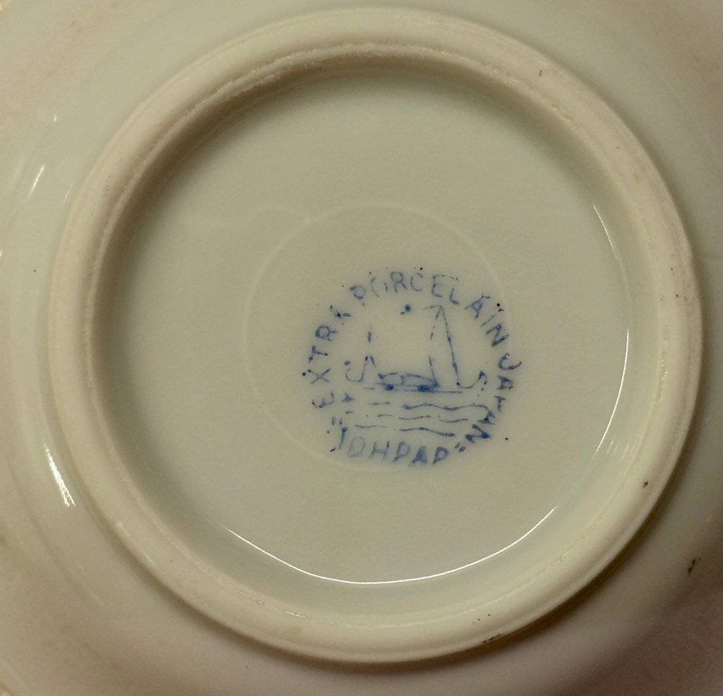 από την Ιαπωνία ένα πιατάκι του γλυκού IOHPAP. στην πίσω όψη «IOHPAP EXTRA PORCELAIN JAPAN» στην περιφέρεια κύκλου, με σήμα το καραβάκι στη θάλασσα.