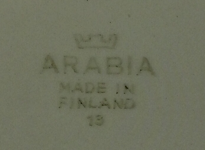 μια πιατέλα από το εργοστάσιο Arabia στη Φινλαδία. στην πίσω όψη «ARABIA / MADE IN / FINLAND / 13» με σχηματοποιημένη κορώνα στην κορυφή και κάτι ακόμη αδιάγνωστο πάνω αριστερά.