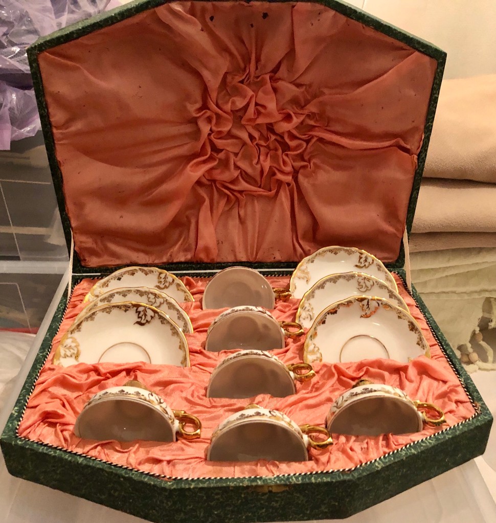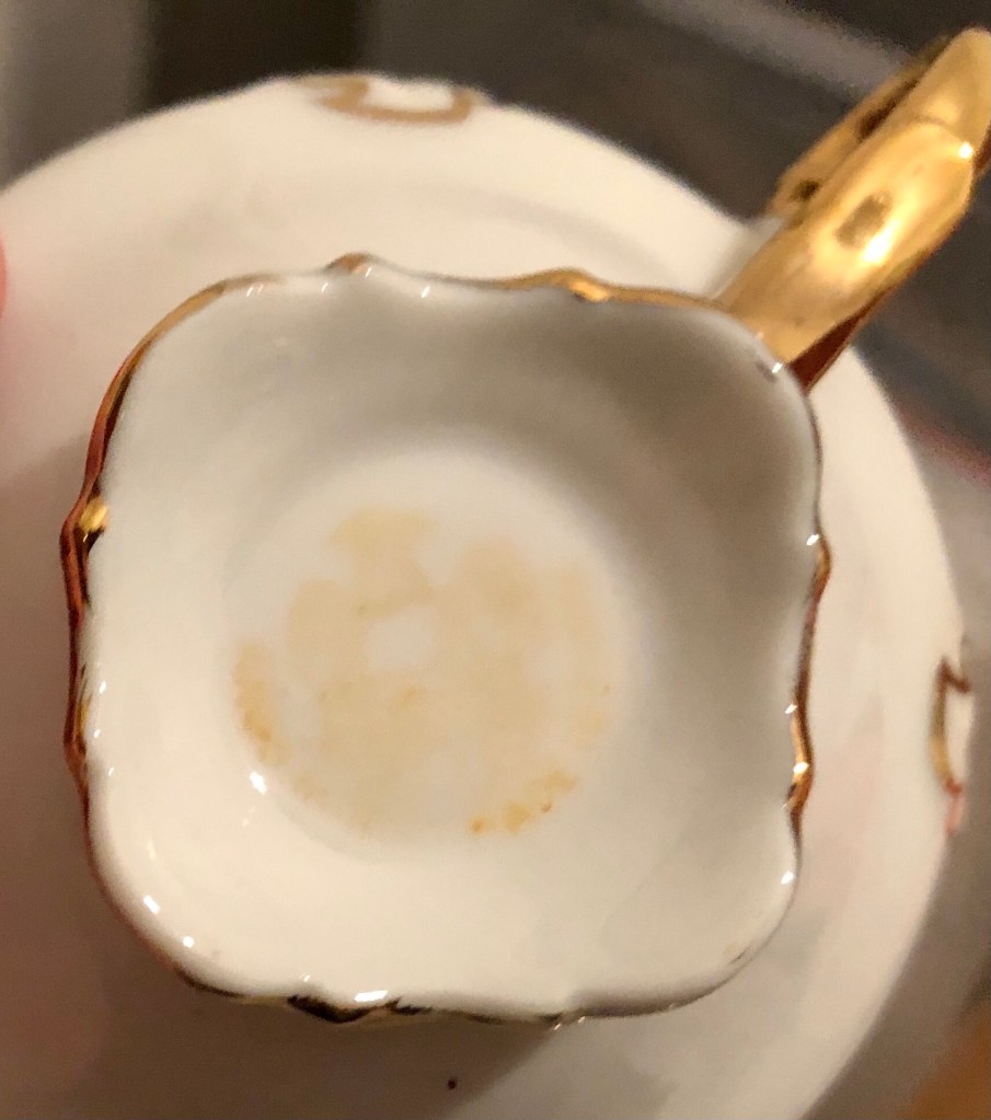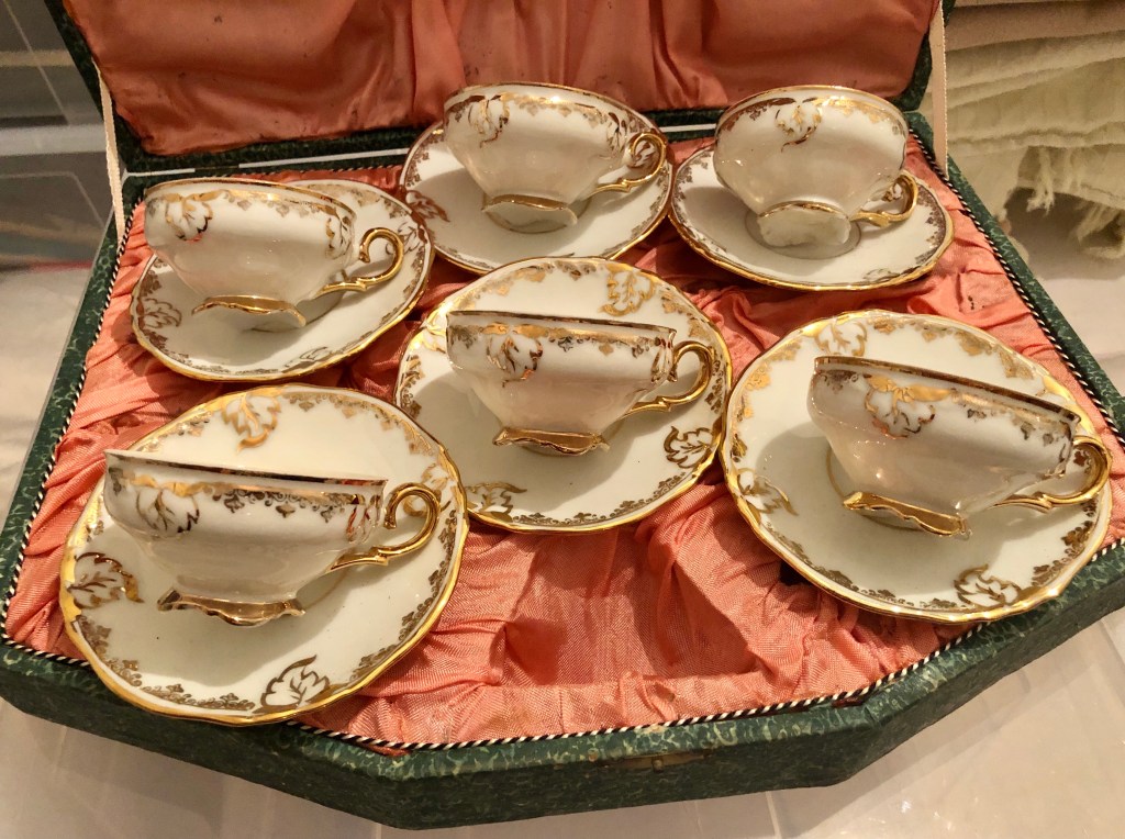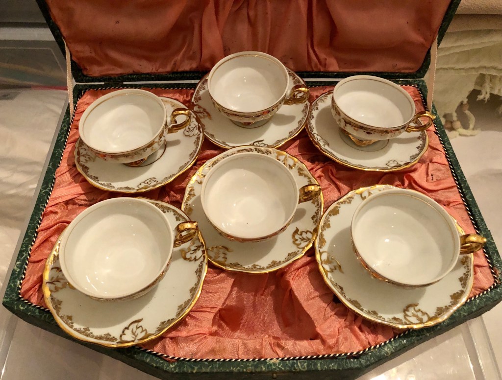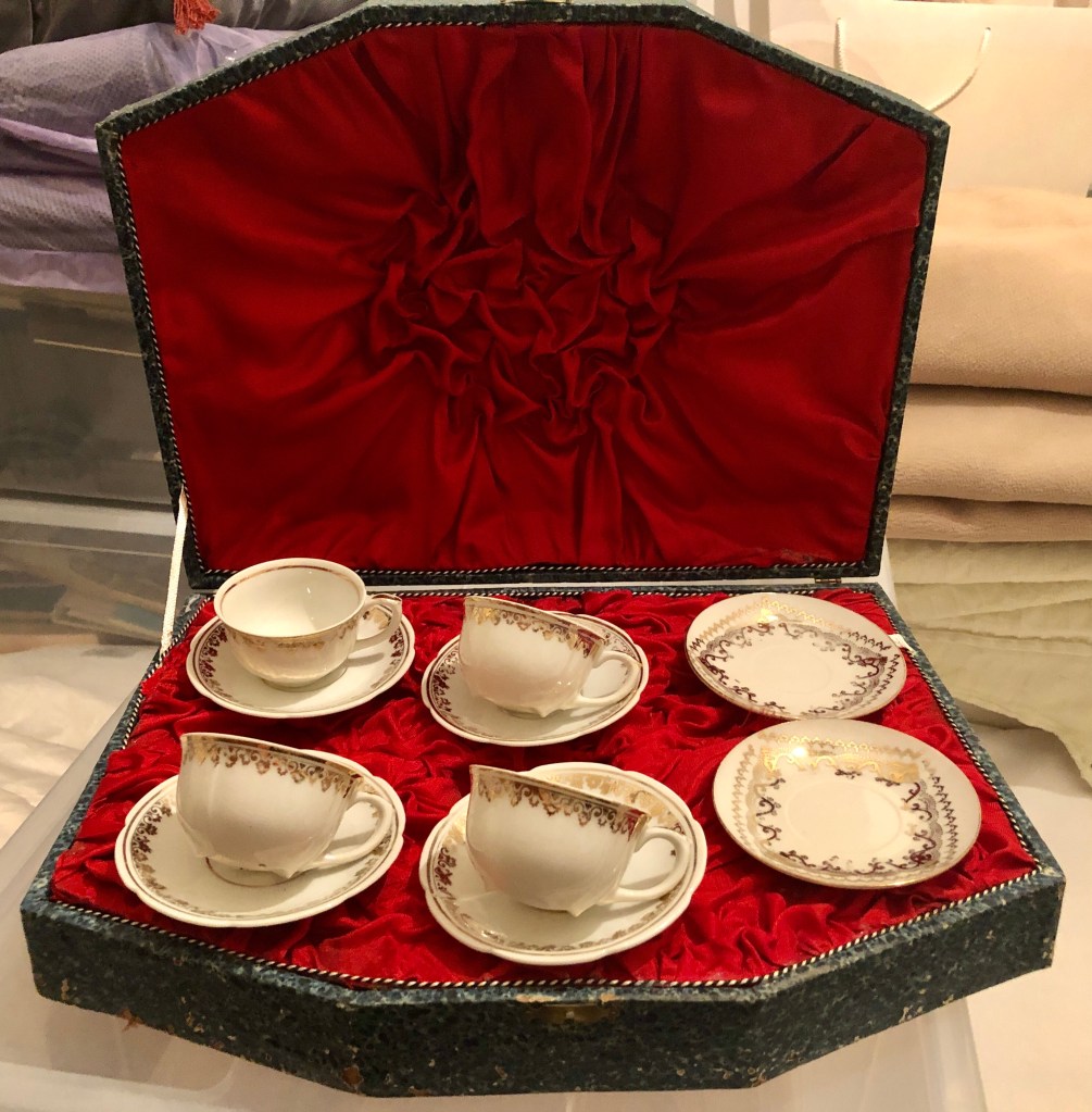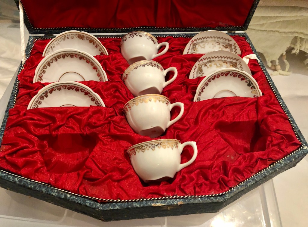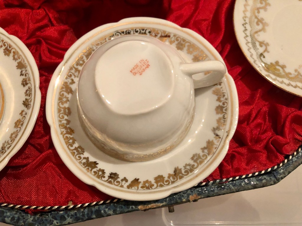 από μια ακόμη εξάδα φλιτζανιών από την Ιαπωνία, συσκευασμένων μάλιστα σε ένα χαρτονένιο κουτί επενδυμένο εσωτερικά με σατέν, σώθηκαν μόνον τέσσερα. κάτω από τη βάση και στην πίσω όψη των πιάτων αναγράφεται MADE IN / OCCUPIED / JAPAN, οπότε γνωρίζουμε ότι κατασκευάστηκαν στην περίοδο της συμμαχικής κατοχής της Ιαπωνίας (1945-1952).