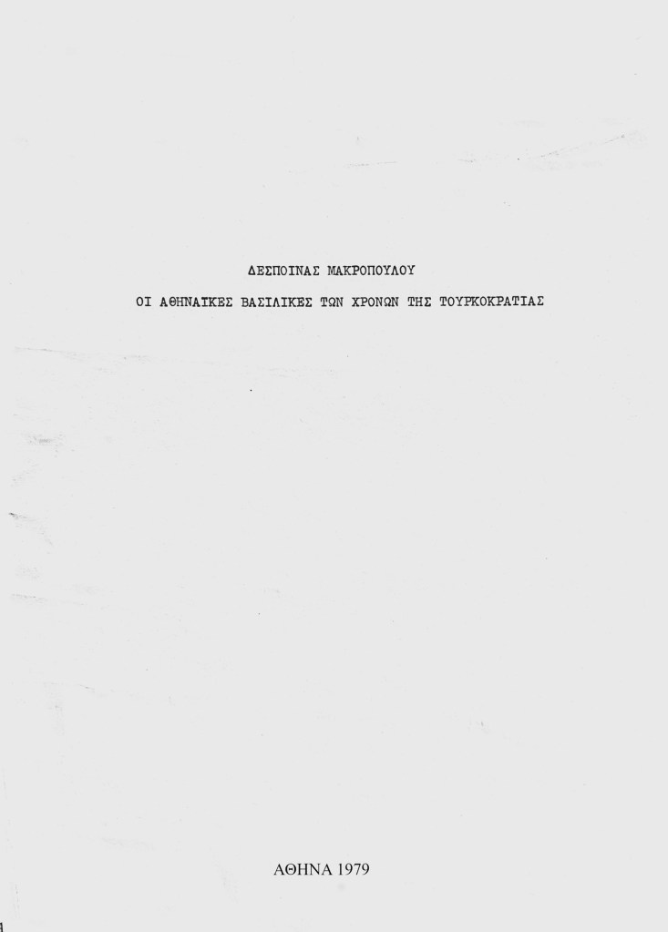 Τη μελέτη αυτή εκπόνησα το 1979 και την παρέδωσα στο τότε Υπουργείο Πολιτισμού και Επιστημών ως απαραίτητη υπηρεσιακή εργασία, που συνέταξα κατά την 8μηνη εκπαιδευτική παραμονή μου στην Αθήνα (9/5/79-31/12/79). Είναι αδημοσίευτη και προφανώς χαμένη στο τεράστιο αρχείο του υπουργικού υπογείου. Το Υπουργείο Πολιτισμού και Επιστημών, με υπουργό τον Δημήτρη Νιάνια, στεγαζόταν στην οδό Αριστείδου 14. Αργότερα μεταφέρθηκε στην οδό Μπουμπουλίνας στα Εξάρχεια.
