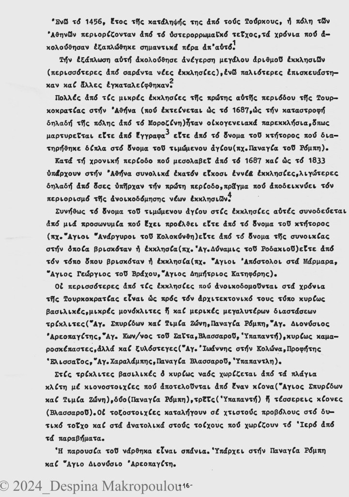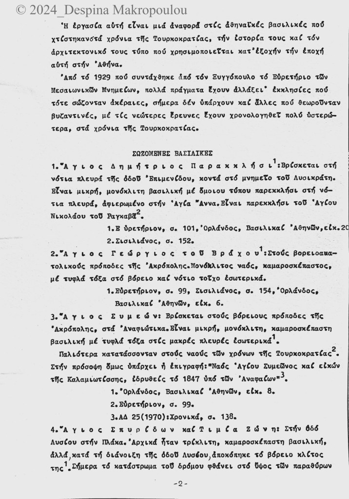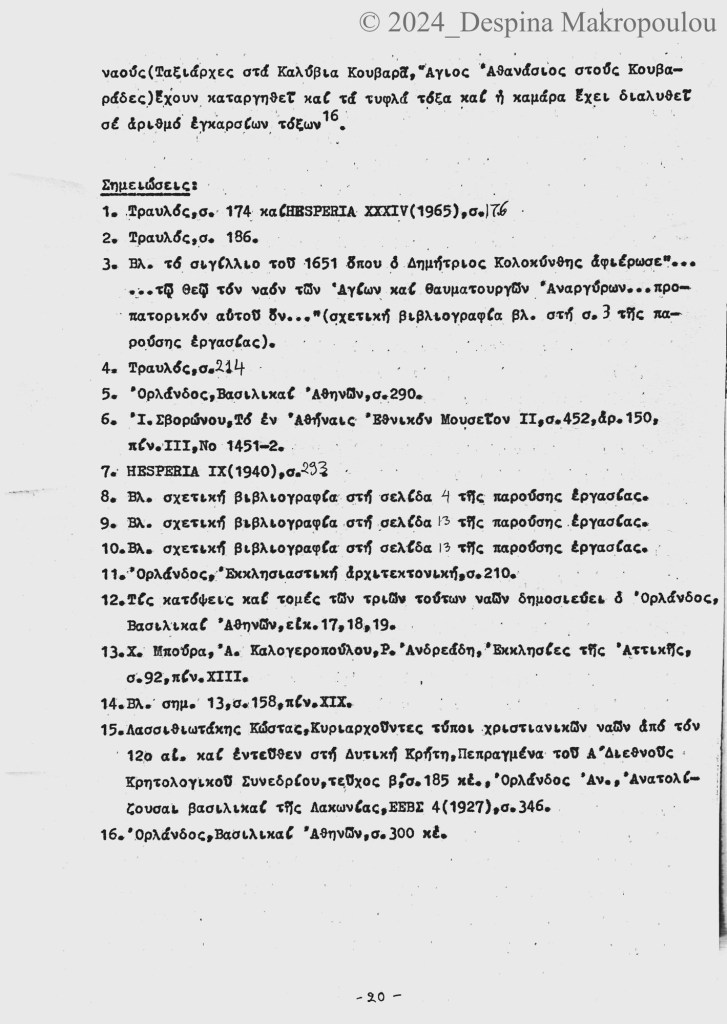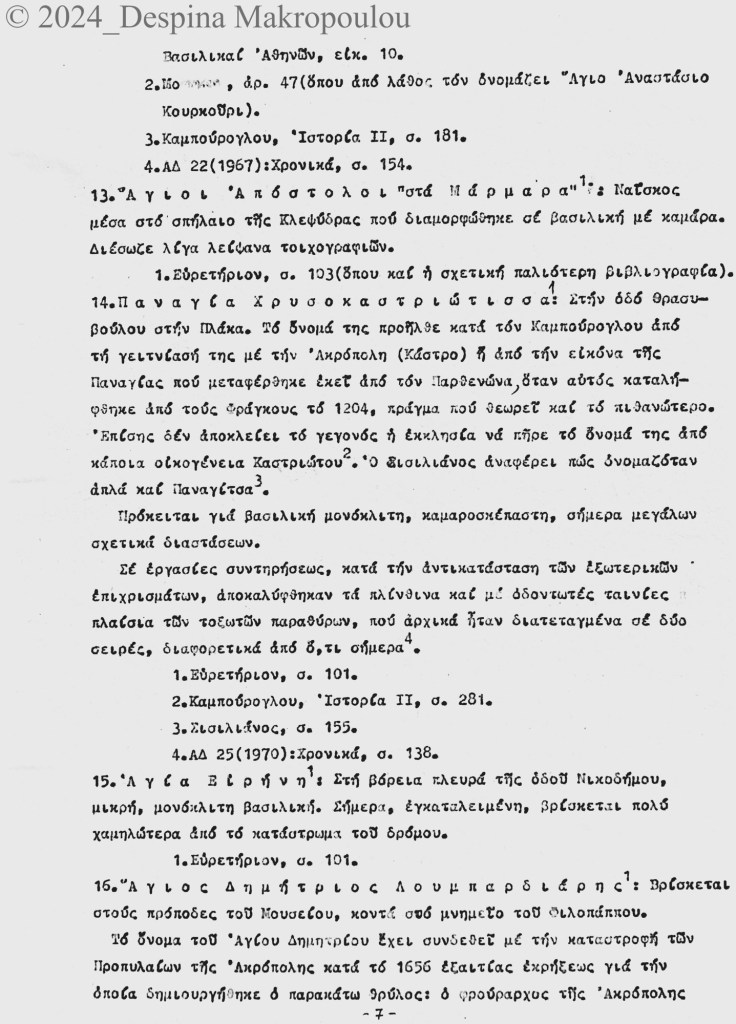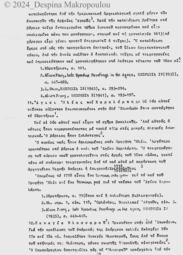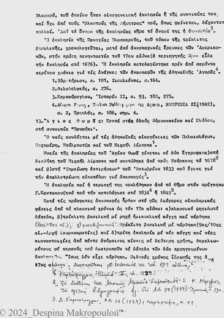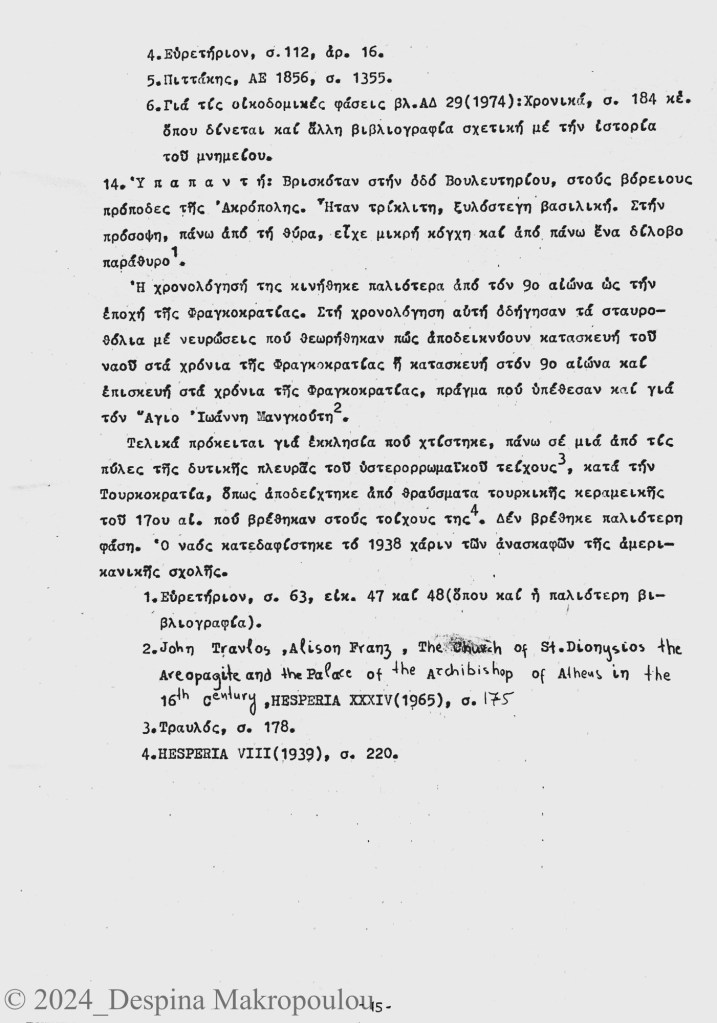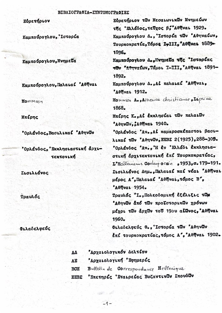 Ο Ορλάνδος, ο Μπίρης, ο Σισιλιάνος, ο Καμπούρογλου, ο Mommsen, ο Τραυλός μου έδωσαν τις μαρτυρίες. Συμπληρωματικά περιόδευσα και σκιτσάρισα. Την εργασία έγραφα σε γραφομηχανή του Βυζαντινού Μουσείου Αθηνών, όπου επέρασα τους πέντε, έξι μήνες μετά το υπουργείο και φταίει ο Παύλος ο Λαζαρίδης που έμαθα γραφομηχανή -δεν είχα ξαναπιάσει, αλλά ο Λαζαρίδης επέμενε, καλή του ώρα και αυτού, πως δεν γίνεται αρχαιολόγος να μην ξέρει να γράφει στη γραφομηχανή-. Κάπου στα αρχεία του Μουσείου υπάρχει το πρώτο μου έγγραφο, που απευθύνεται “Προς την Υπηρεσίαν Αρχαιοτήτων και Αρναστηλώσεως” (sic).