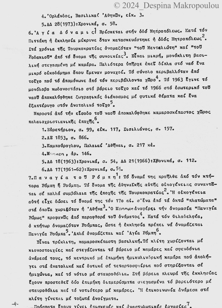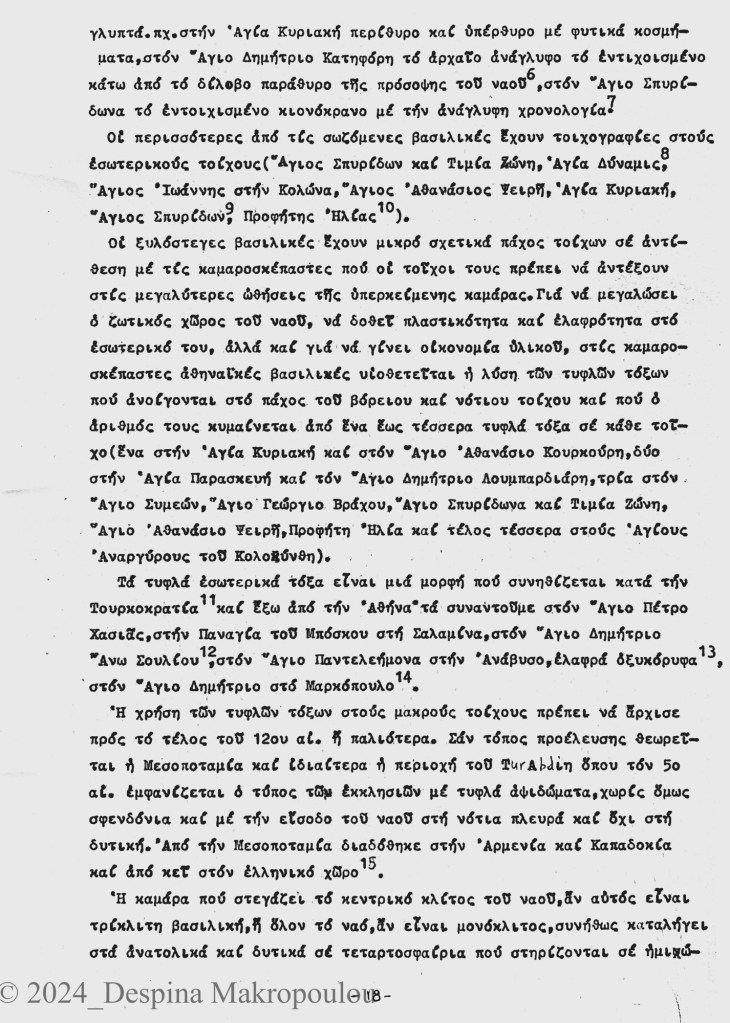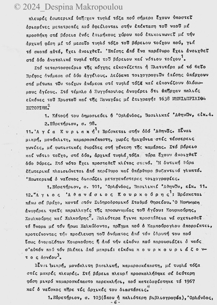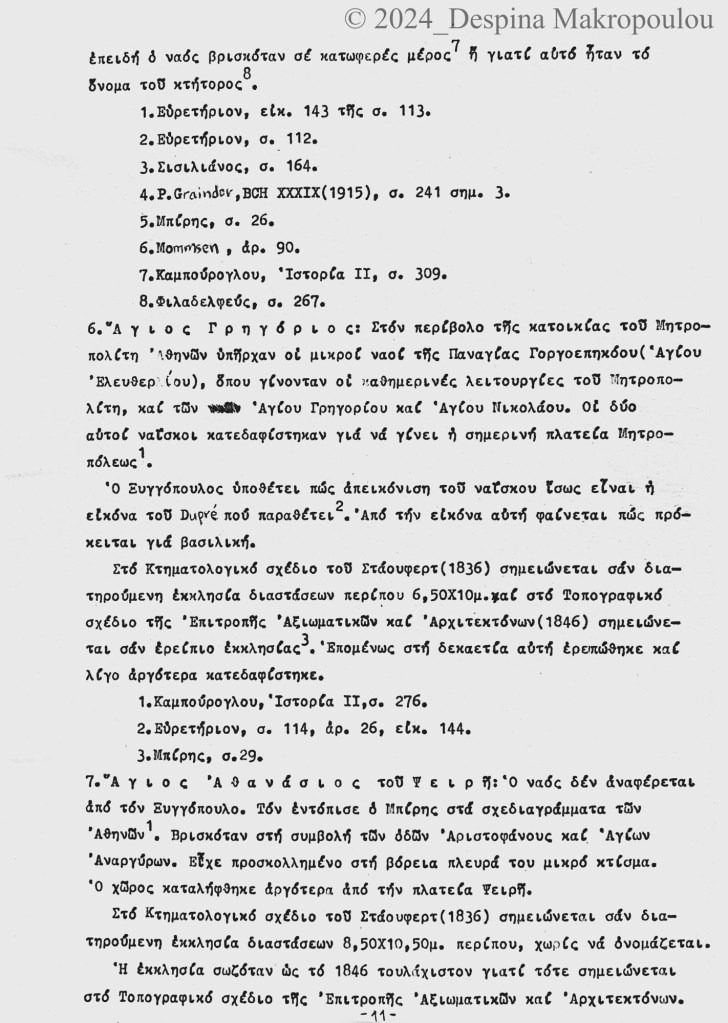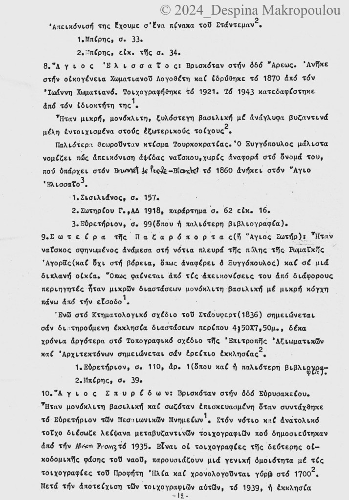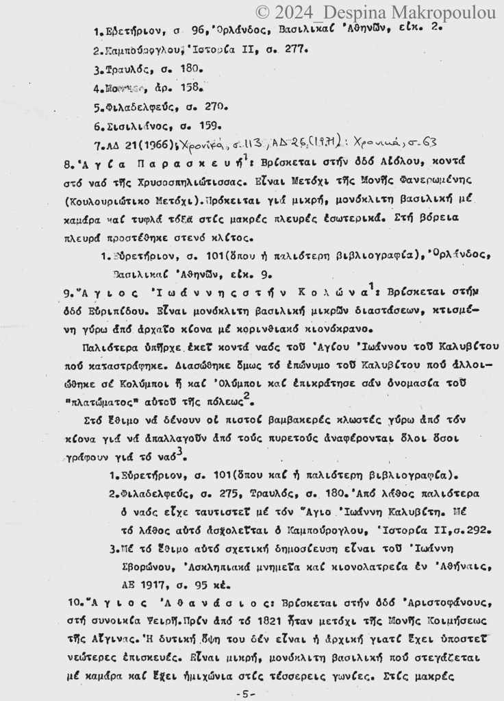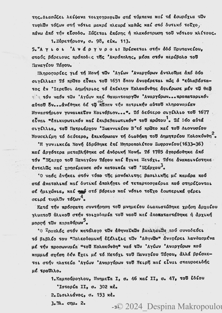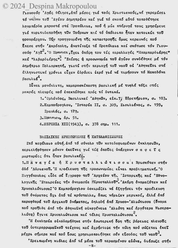 Ο Ορλάνδος, ο Μπίρης, ο Σισιλιάνος, ο Καμπούρογλου, ο Mommsen, ο Τραυλός μου έδωσαν τις μαρτυρίες. Συμπληρωματικά περιόδευσα και σκιτσάρισα. Την εργασία έγραφα σε γραφομηχανή του Βυζαντινού Μουσείου Αθηνών, όπου επέρασα τους πέντε, έξι μήνες μετά το υπουργείο και φταίει ο Παύλος ο Λαζαρίδης που έμαθα γραφομηχανή -δεν είχα ξαναπιάσει, αλλά ο Λαζαρίδης επέμενε, καλή του ώρα και αυτού, πως δεν γίνεται αρχαιολόγος να μην ξέρει να γράφει στη γραφομηχανή-. Κάπου στα αρχεία του Μουσείου υπάρχει το πρώτο μου έγγραφο, που απευθύνεται “Προς την Υπηρεσίαν Αρχαιοτήτων και Αρναστηλώσεως” (sic).