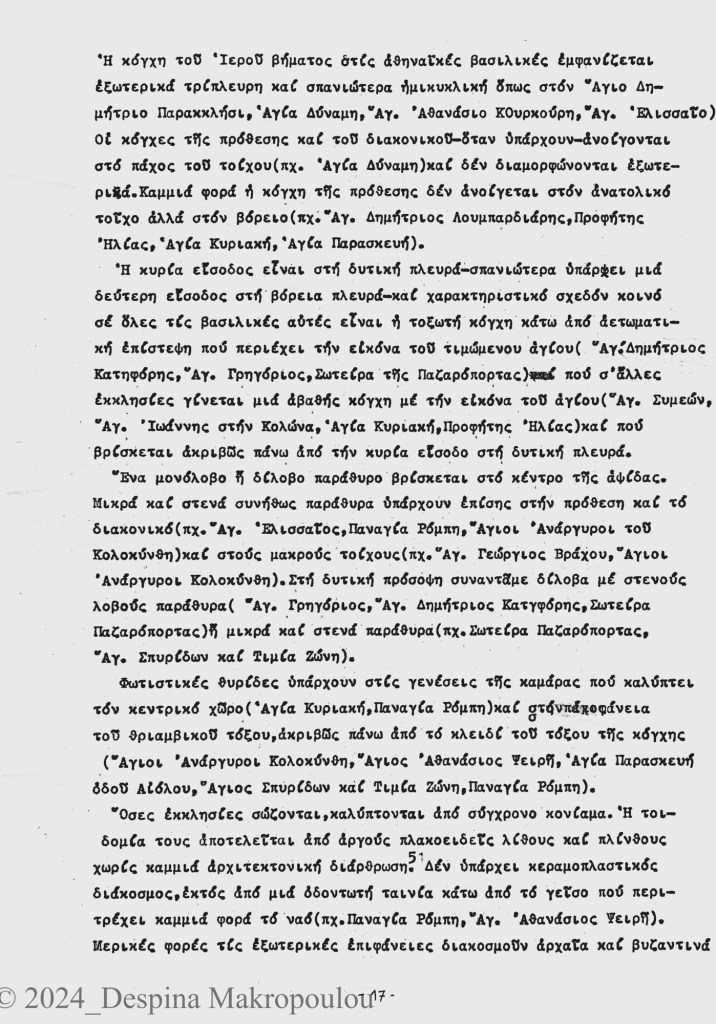 Στη μελέτη περιλαμβάνονται 16 σωζόμενες βασιλικές (Άγιος Δημήτριος «το Παρακκλήσι», Άγιος Γεώργιος του Βράχου, Άγιος Συμεών, Άγιος Σπυρίδων και Τιμία Ζώνη, Άγιοι Ανάργυροι, Αγία Δύναμις, Παναγία του Ρόμπη, Αγία Παρασκευή, Άγιος Ιωάννης στην Κολώνα, Άγιος Αθανάσιος, Αγία Κυριακή, Άγιος Αθανάσιος Κουρκούρης, Άγιοι Απόστολοι στα Μάρμαρα, Παναγία Χρυσοκαστριώτισσα, Αγία Ειρήνη, Άγιος Δημήτριος Λουμπαρδιάρης) και 14 ερειπωμένες ή κατεδαφισμένες βασιλικές (Παναγία η Κρυσταλλιώτισσα, Άγιος Διονύσιος Αρεοπαγίτης, Αγία Παρασκευή, Άγιος Κωνσταντίνος του Σαΐτα, Άγιος Δημήτριος Κατηφόρης ή του Κατηφόρη, Άγιος Γρηγόριος, Άγιος Αθανάσιος του Ψειρή, Προφήτης Ελισσαίος, Σωτείρα της Παζαρόπορτας ή Άγιος Σωτήρ, Άγιος Σπυρίδων, Άγιοι Ηλίας και Χαραλάμπης, Παναγία Βλασσαρού, Άγιος Θωμάς, Υπαπαντή).