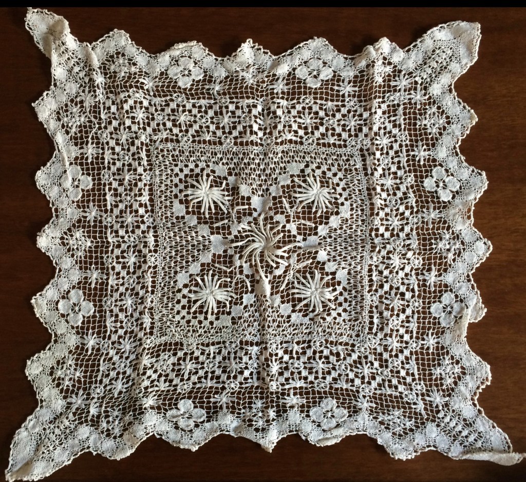 μια δαντέλα από την προίκα της Αγαθής Σχουλίδου, πλεγμένη στο Πελαδάρι της Βιθυνίας περίπου στα 1885-1890. την αγαπούσε η Αγαθή, είχε κοπιάσει πολύ να την κεντήσει. την είχε καταχωνιάσει στο μπογαλάκι της που κουβαλούσε στο πλοίο τις μέρες της δραματικής φυγής από το λιμάνι των Μουδανιών, Αύγουστο του 1922, δεν μπορούσε να την αφήσει πίσω, 41 χρονών γυναίκα τότε.