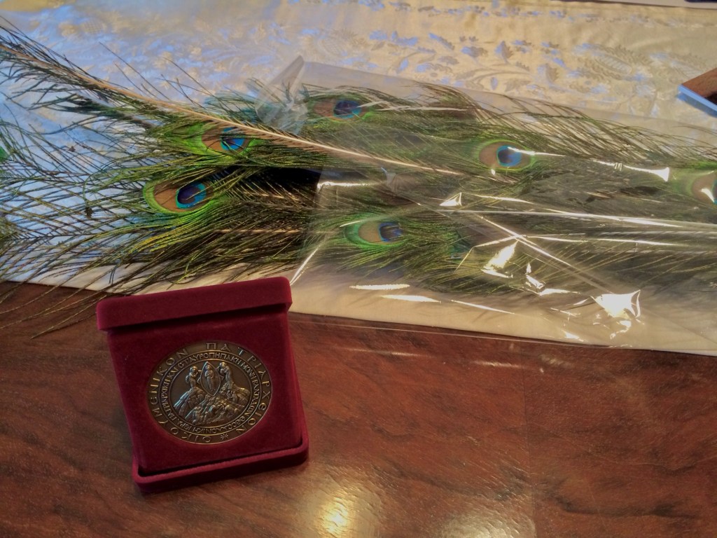 σκαλευτικόν πτηνόν ο ταώς. έβαλα το χέρι μου το 2019Γενάρης 2014. βράβευση από τον πατριάρχη για τις υπηρεσίες που ασμένως προσφέραμε. μετάλλιο συνοδευόμενο από γιγάντια ανθοδέσμη με παγωνόφτερα από τα πουλιά που κατοικούν στην αυλή του μοναστηριού.το πακέτο με τα δώρα κοσμούνταν με χειροποίητο κέρινο λουλούδι.
