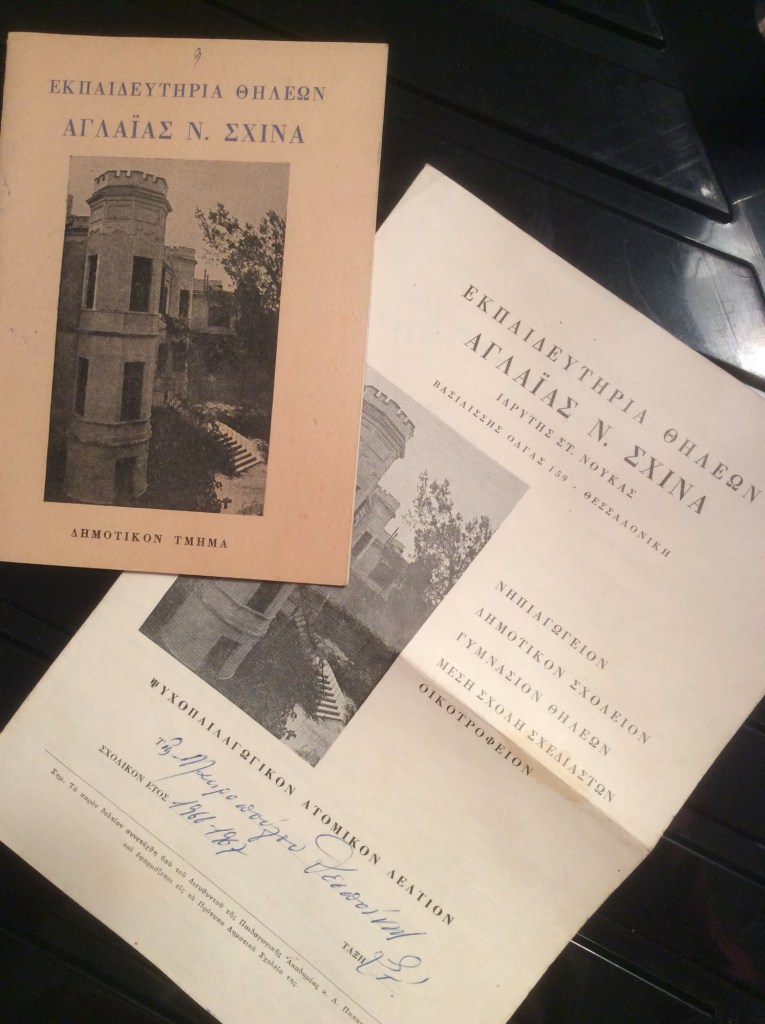 οικία Χασάν Ασίζ Καπαντζή1961-1967_το σήμα Εκπαιδευτήρια Σχινά που ήταν ραμμένο στην ποδιά μου1966-1967_ο έλεγχός μου & ψυχοπαιδαγωγικόν ατομικόν δελτίον_ΣΤ τάξη1966-1967_ο έλεγχός μου_ΣΤ τάξηαπό το βιβλίο του Β.Κολώνα, Η Θεσσαλονίκη εκτός των τειχών. Εικονογραφία της συνοικίας των Εξοχών (1885-1912)1966_03_25_Ε΄Δημοτικού στην αυλή του σχολείου μου με τη μαμά και τον παππού μου μετά το τέλος του θεατρικού δρώμενου. στη δεξιά άκρη μόλις και εικονίζεται η διευθύντριά μας Αγλαΐα Σχινά που επιστρέφει στο γραφείο της μετά τη γιορτή. το γραφείο της με τις δαντελένιες κουρτίνες ήταν στον πρώτο όροφο, στο βάθος αριστερά.